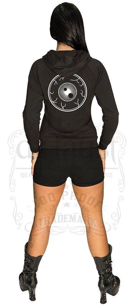 From our line of alternative zip Hoodies for women, Camilla is a black hoodie made of high quality cotton featuring an unsettling representation of an eyeball, complete with small veins all around it.