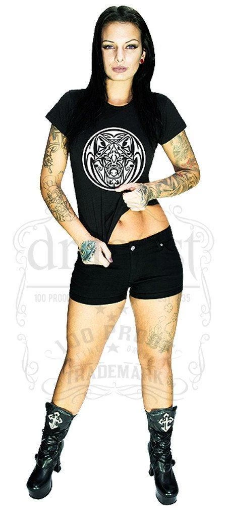 From our line of alternative round neck T-Shirts for women, Dakota is a black tee made of high quality cotton featuring a mysterious figure in a white circle. It has cat ears, but unnaturally human looking eyes. It could be a reproduction of an ancient engraving on monolith stones, a god of the forest, we will never know. This gothic style on a simple but stylish shirt is a tribute to this beautiful culture and tradition, and also is to bring good luck to all the living!