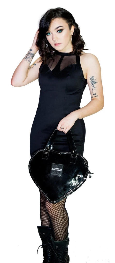 Black Patent Heart Shoulder / Hand Bag with a handle and shoulder strap.