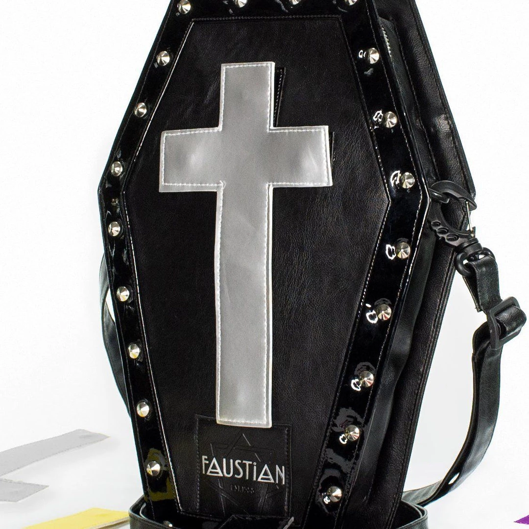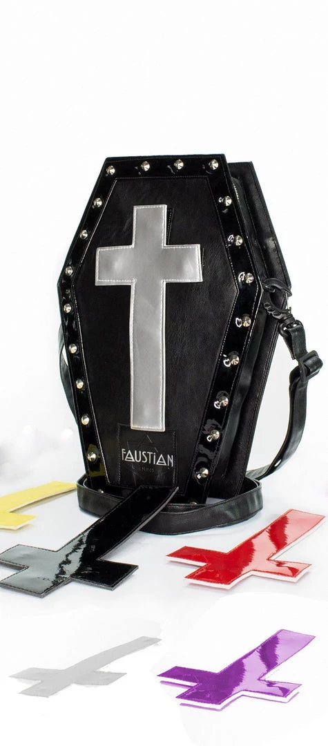 Black Vegan Leather Coffin Shoulder Bag with metal studs and magnetic coloured crosses that can be replaced in an instant to fit with your outfit or mood.